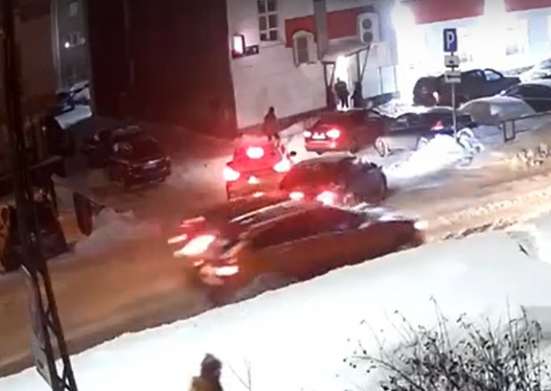 Все случилось в 21:38. На кадрах видно, как перед пешеходным переходом один автомобиль останавливается, а в него в это время врезается машина, ехавшая следом.