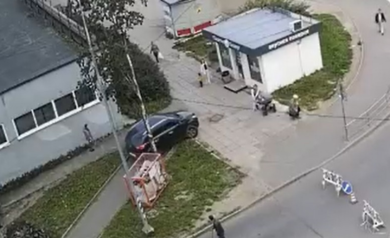 На кадрах видно, как автомобиль едет по тротуару и по газону, распугав при этом прохожих, среди которых была женщина с коляской.