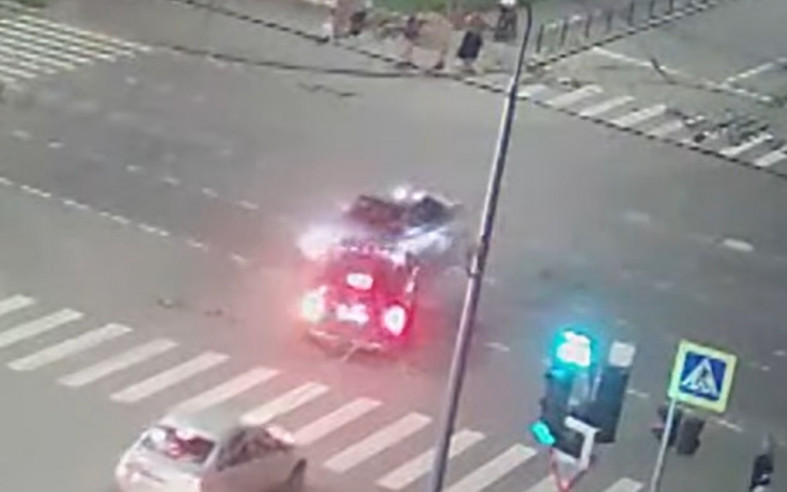 На кадрах видно, как легковой автомобиль, ехавший прямо по проспекту, врезался в машину, совершавшую левый поворот.
