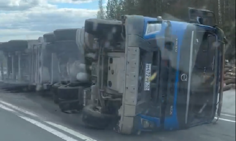 Проезжавшие мимо водители запечатлели на свои видеорегистраторы огромную перевернутую машину. В кадре видно, что бревна раскатились по проезжей части.