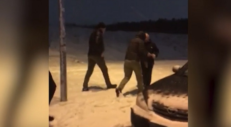 Слышно, как за кадром один ребенок кричит «Отойди», а потом «Убеги, пап». Второй мальчик также кричит, чтобы папа убегал. В кадре – трое мужчин, которые окружили мужчину. Один из них повалил пенсионера на землю и обхватил его за шею сзади.