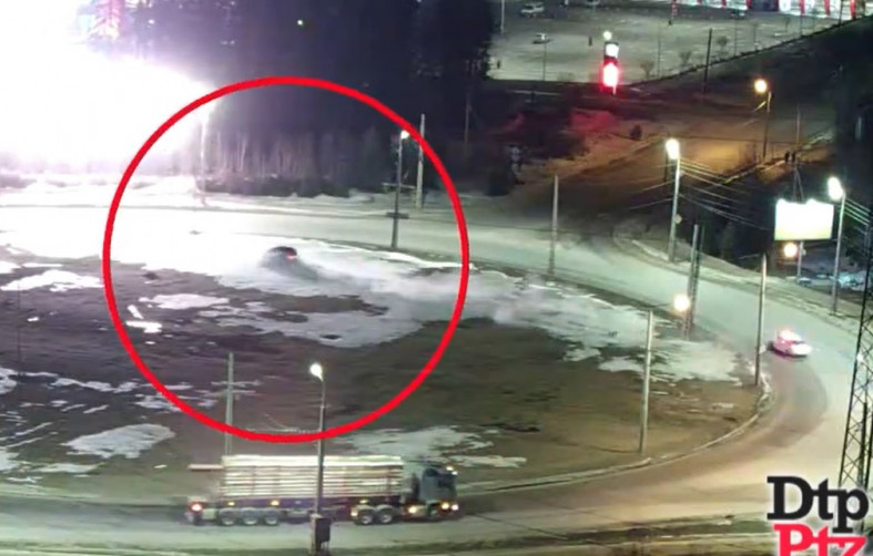 В этот момент в левом ряду двигался грузовик. Произошло столкновение. Dtpptz.ru предположило, что грузовой автомобиль двигался на разрешающий сигнал светофора. // фото скриншот видео