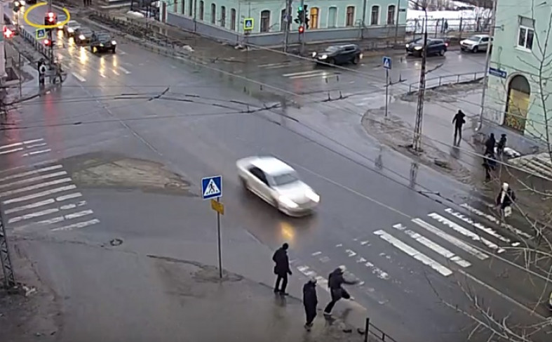 Камера уличного наблюдения зафиксировала, как 20 марта в 18:47 водитель легкого автомобиля проехал на красный сигнал светофора, чуть не сбив людей.