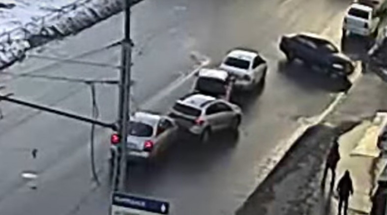 На кадрах видно, как легковой автомобиль на приличной скорости влетел в остановившуюся машину. Ту отбросило вперед, в результате поврежденными оказались еще два транспортных средства.
