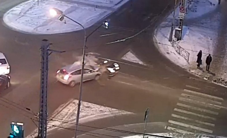 На кадрах видно, как автомобиль, на большой скорости ехавший прямо по проспекту, врезался в машину, выполнявшую левый поворот. После аварии второй автомобиль отбросило на тротуар, где стояли пешеходы. Те успели отскочить.