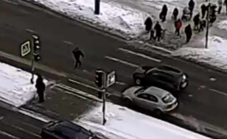 Все случилось в 12:38. На кадрах видно, как пешеход переходит дорогу, но потом резко разворачивается и бежит обратно. В этот момент его сбивает автомобиль.