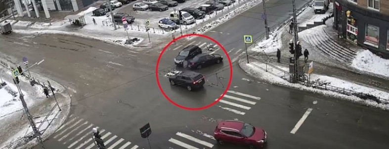 Все случилось, когда водитель одного автомобиля собирался поворачивать налево, другой двигался в сторону закрытого моста, а третий – вниз по Красной. Авария произошла в 13:06 и попала в объектив камер наблюдения «Сампо» и CityLink, сообщает dtpptz.ru. Транспортные средства получили механические повреждения. // скриншот видеозаписи