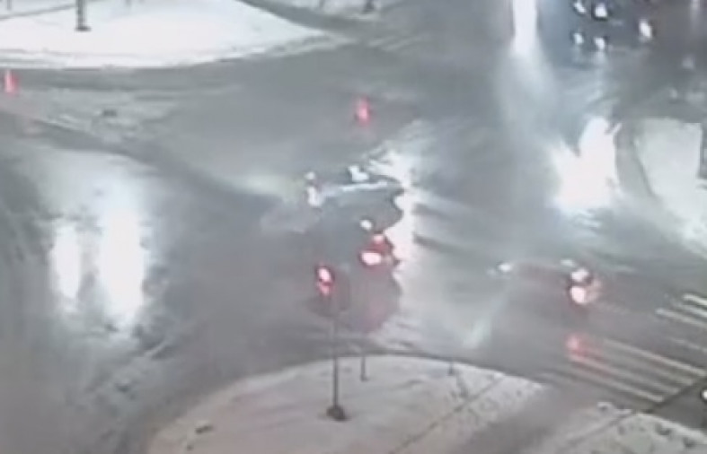 На кадрах видно, как автомобиль, двигавшийся по улице Ровио, выехал на перекресток на запрещающий сигнал светофора. В результате он столкнулся с машиной, которая начала движение по улице Лыжной.