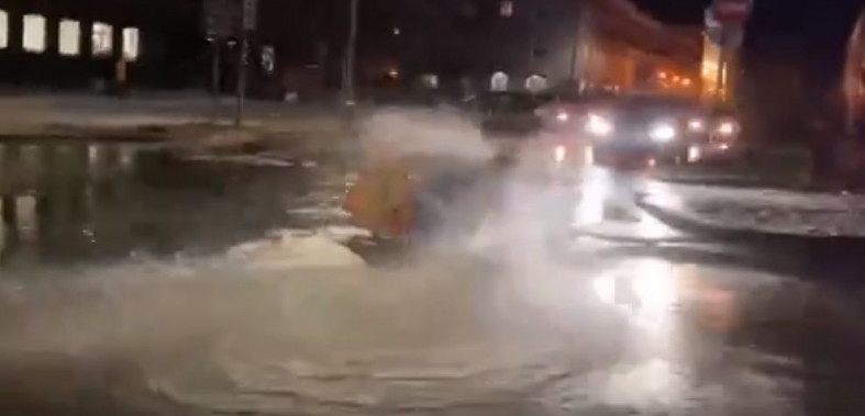 В центре Петрозаводска на перекрестке улиц Кирова и Свердлова из-под земли забил фонтан. Видео, на которой запечатлена коммунальная беда, опубликовало вечером в пятницу сообщество «Карелфорния News». Вода хлестала из коллектора.