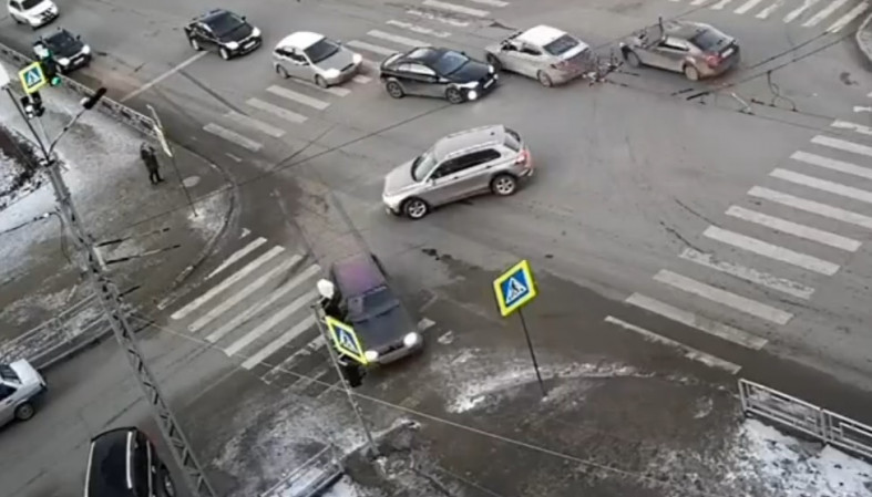 На кадрах видно, как легковой автомобиль, двигавшийся в сторону проспекта Ленина, пытался проскочить перекресток. В этот момент левый поворот выполнял внедорожник. Уходя от столкновения, легковушка ушла вправо и вылетела на тротуар.
