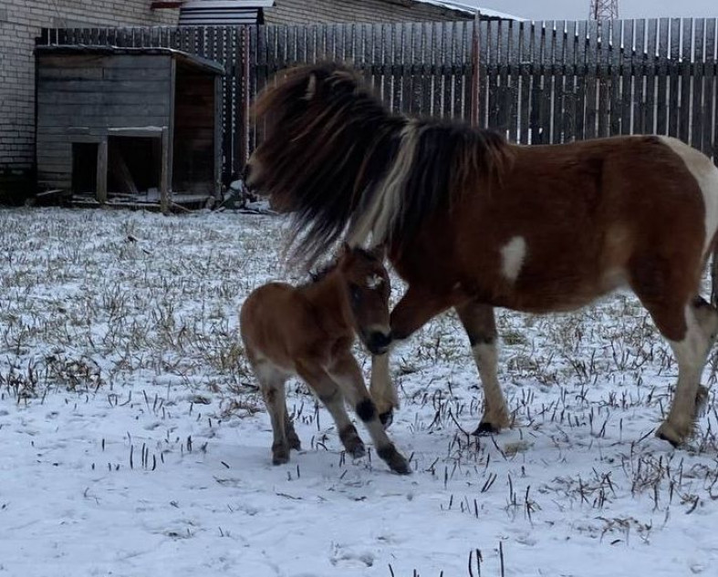 У обитателей конюшни в селе Деревянное пополнение. В начале ноября там родился озорной жеребенок породы шетлендский пони. Один глаз у него голубой, а другой карий, а во лбу у него белая звездочка. Владельцы фермы еще думают над именем.