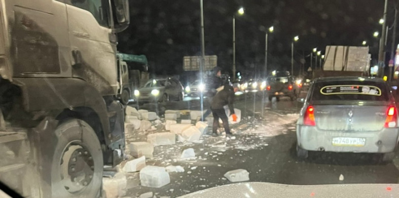 Как видно на снимках, грузовик рассыпал по проезжей части множество кирпичей, это было около 18:00. // фото, видео:«ДТП Петрозаводска и Карелии» / ВКонтакте