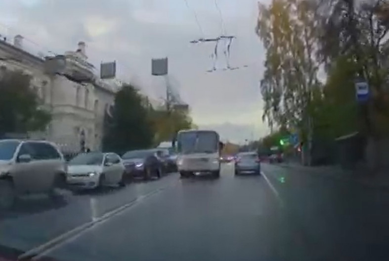 На кадрах видно, как автобус едет по улице Кирова в сторону проспекта Ленина. При этом водитель, не желая стоять в пробке, объезжает ее по встречной полосе, миновав при этом двойную сплошную.
