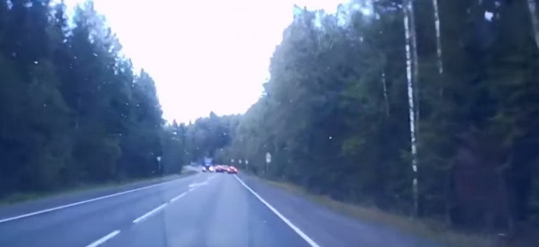 Автомобилист сумел втиснуться между двух машин, двигавшихся в своей полосе попутно. На повороте он снова совершил обгон и, вероятно, задел кроссовер, так как автомобиль сразу остановился.