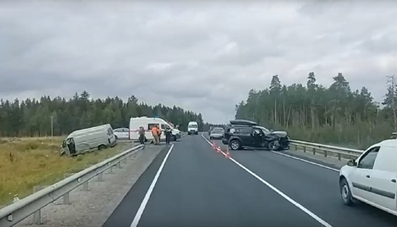Микроавтобус и внедорожник столкнулись 27 августа на автодороге «Кола» в Карелии. Очевидец опубликовал видео в паблике «Подслушано у водителей Птз и Карелии» ВКонтакте.