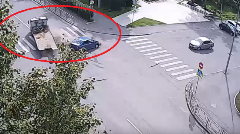 В кадре видно, что грузовой автомобиль несется с довольно большой скоростью, когда со второстепенной дороги выезжает легковушка. Водитель эвакуатора пытается отклониться, но не успевает.