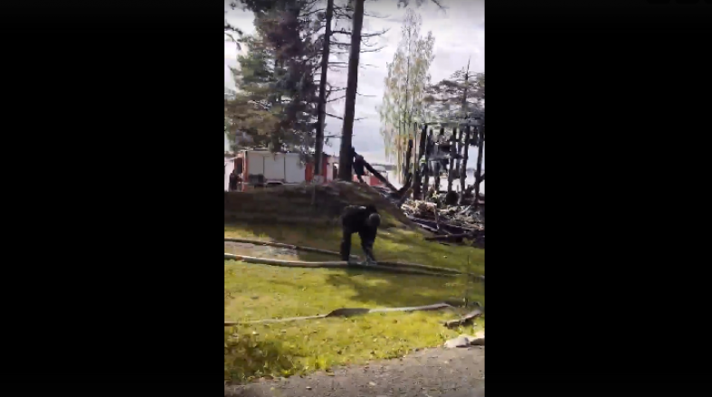 В кадре видно, что с огнем борются спасатели. Однако пламя уже практически полностью уничтожило строение, увидеть это можно здесь.