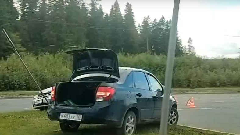 Автомобили столкнулись на повороте, они оба смяты, поврежден также столб с дорожным знаком – он сильно накренился. // фото, видео: «Подслушано у водителей Петрозаводска и Карелии»/ВКонтакте