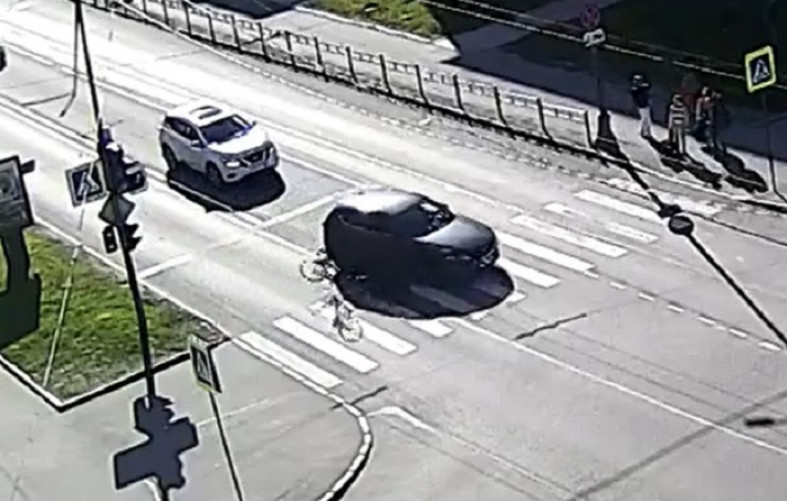 Все случилось в 17:08. На кадрах видно, как легковой автомобиль сбивает велосипедиста, ехавшего по проезжей части.