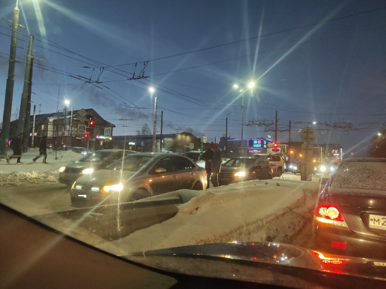 Некоторые подписчики отметили, что дороги заужены из-за неубранного снега. Другие не оценили поступок водителя, который на перегруженном перекрестке затормозил для пропуска троллейбуса. Также водителям посоветовали держать дистанцию. (фото паблик «ДТП Петрозаводска и Карелии»)