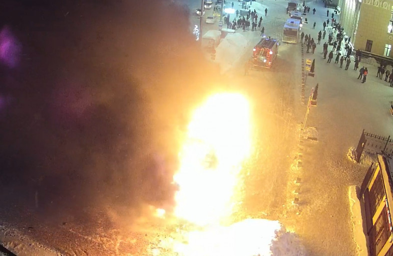На площадь прибыли несколько пожарных машин и скорая помощь. К 20 часам основное пламя удалось сбить.
