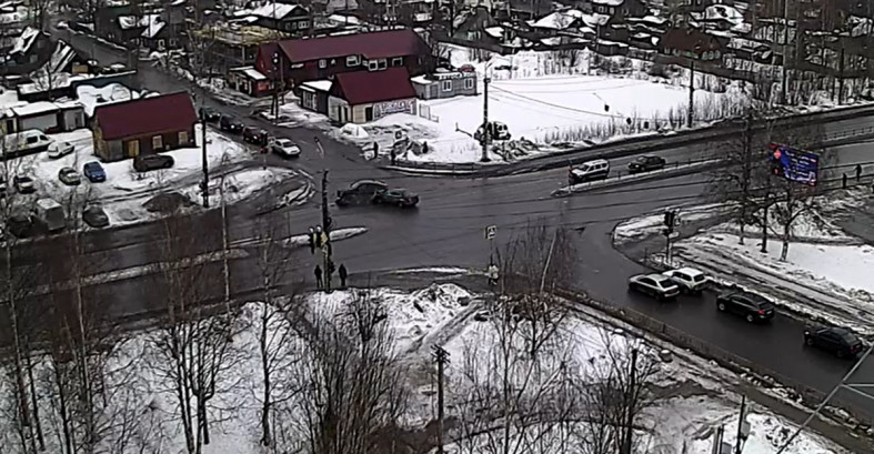 Вечером 4 марта в самом центре Петрозаводска произошло жесткое ДТП. У железнодорожного вокзала столкнулись два автомобиля, инцидент попал в объектив камеры наблюдения компании CityLink.