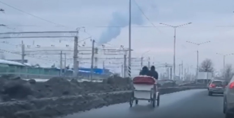 Конная повозка передвигалась по Первомайскому проспекту в Петрозаводске. Тащила «карету» одна лошадиная сила, а сидели в ней двое, предположительно, несовершеннолетних.