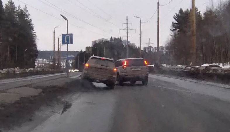 На кадрах видно, как один из внедорожников решил уйти на разворот с правой полосы. В этот момент в этот автомобиль врезался другой.