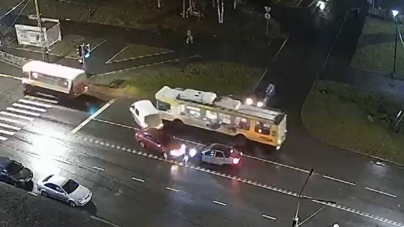 В 18:29:56 в полосе появился белый микроавтобус, водитель решил перестроиться в право прямо в троллейбус. Протиснуться ему не удалось. В итоге «рогатый» его слегка подмял прямо в одну из машин в левой полосе. Троллейбус дальше не поехал, из салона вышли люди. Все случилось в районе остановки «Генерала Фролова», напротив детской поликлиники №2. Другим участникам движения пришлось объезжать место групповой аварии по встречной полосе.
