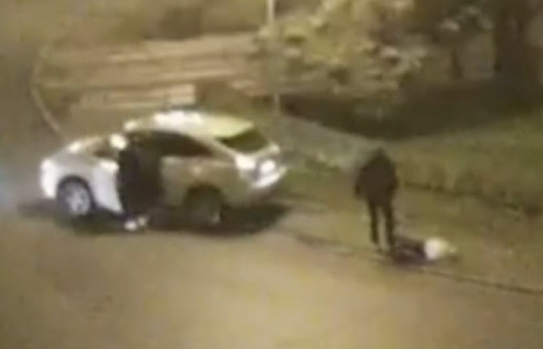 Затем автомобиль заходит на второй круг. В итоге несколько мужчин подбегают к машине, открывают дверь и вытаскивают из салона водителя, который падает на землю без чувств. Автомобиль выезжает на газон.