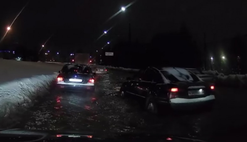 Как сообщают горожане, проезжая часть залита внушительным слоем воды. Автомобили буквально плывут по магистрали. Водителям советуют не рисковать своим транспортом и выбирать пути объезда.
