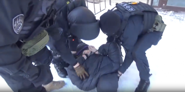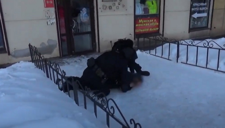 Пресс-центр МВД опубликовал видео операции силовиков. Мужчину задержали на проспекте Невского в Петрозаводске. Силовики уложили мужчина на землю, надели наручники и отвели в автомобиль «УАЗ Патриот».