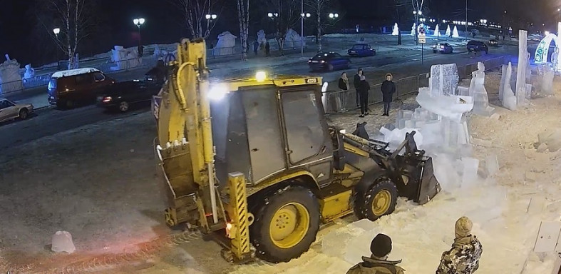 Фигуры разрушили, а куски льда экскаватор сбросил в озеро. Процесс запечатлели камеры видеонаблюдения «Сампо.ру».